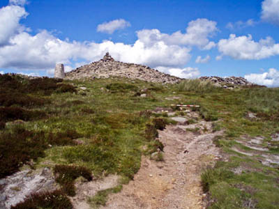 The prehistoric cairn in the centre with the trig point on its left and a modern cairn on its right