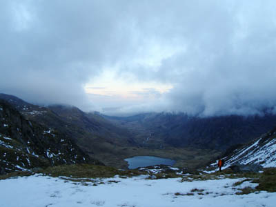 Looking down from our perch the bowl of Cwm Idwal was thick with snow and the mountainside below peppered with the torchlights of our colleagues. The cloud suddenly thickened, swirling around us and sending icy blasts of wind across the face of the hillside. The torchlight below dimmed as the mist descended threatening to fall below the helicopters altitude. If this happened the pick-up would have to be aborted and we would lose our opportunity.