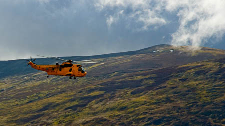 As we were bringing Pauline up, the drone of 22 Squadron’s Sea King helicopter could be heard making its way up the valley. The first plan was for the helicopter to make a rescue attempt from the position we found ourselves in. If this failed we would attempt to lower the casualty using the stretcher to a point low enough down the mountain and clear of the cliffs for the chopper to make the pick-up. As team members we knew what to expect from the approach of the helicopter close to the cliffs in winter conditions. There was no time to give the others more than the most basic instructions – ie, not to look at the helicopter with head torches, which might blind the crew using night vision glasses and to secure any loose items.