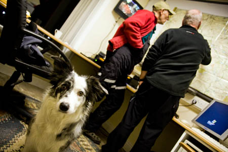There’s the sound of paws outside the control room. Abbie has arrived with her handler Ken Sloan, 38 years with Woodhead team and 22 years with Sarda. Abbie is six years old and is recovering from cruciate ligament problems. She was graded last year and upgraded last month and is one of two dogs with the team. Abbie is the third dog Ken has trained.