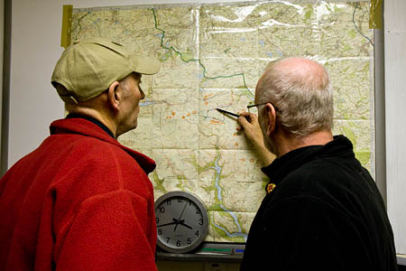 In the warmth of the control room, 7km (4 miles) away, Mike France is planning the search strategy and keeping tabs on the men and women out on the mountain. A Woodhead MRT member for 40 years, he was team leader for 12 years until last year when he stood down. His map is marked with the search area and the position of every search party.