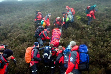 Visibility has dropped to about 100m as the Bleaklow weather comes in but after what seems like an eternity, the breathless stretcher party arrives and the ‘casualty’ is put into a fleecy bag and strapped securely into the Bell stretcher.