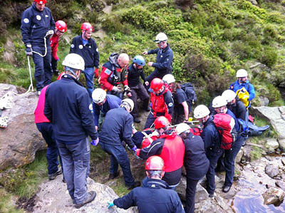 Edale and Buxton Mountain Rescue Teams were alerted late on Sunday afternoon when the woman, from Cornwall, slipped while descending Crowden Brook after a walk on Kinder Scout.