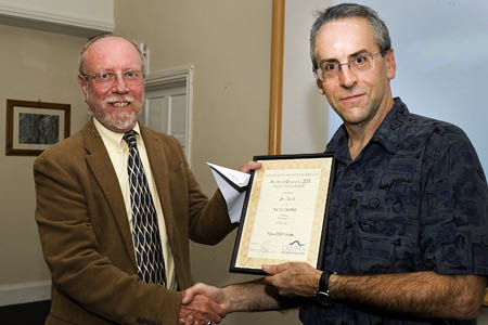 OWPG president Roly Smith, left, presents outdoor feature award to Jon Sparks. Photo: Rudolf Abraham