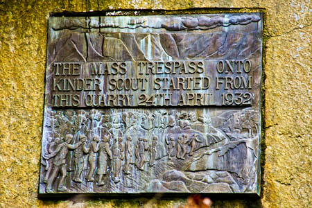 The plaque in Bowden Bridge Quarry, Hayfield, Derbyshire, commemorating the Kinder Scout mass trespass of April 1932