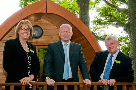 YHA chief executive Caroline White, William Hague, centre, and YHA chairman Chris Darmon stand outside one of the camping pods in the grounds of YHA Grinton Lodge. Photo: SLB Photography