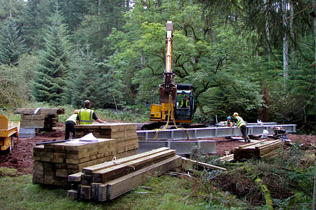 “We used two diggers to push and pull the beams across the river. We were fortunate that stone abutments from old forestry bridges were already in place and in good condition, and we managed to do the work without having to take machinery into the river.”