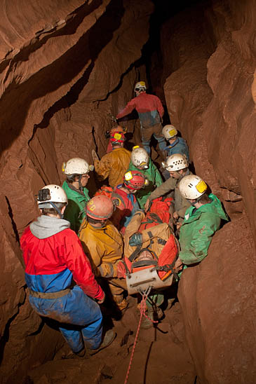 “By installing a stemple between the two bolts and tying a sling under his armpits we were able to raise him vertically for the crucial first 10cm, before using brute force to rotate him and drag him out of the rift.
