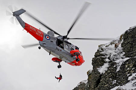 In blizzard conditions, plummeting temperatures and pitch darkness, the team from HMS Gannet at Prestwick in Ayrshire flew its Sea King Mark 5 helicopter to the aid of walker Dr Gareth Bradley who had a reported broken ankle.