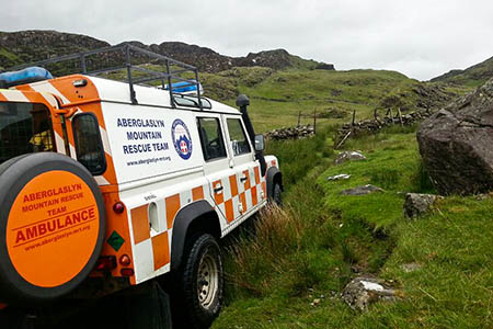 The uninjured DofE team members were airlifted to a waiting Aberglaslyn Mountain Rescue Team Land Rover. Photo: Aberglaslyn MRT