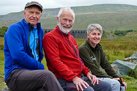 Alan Hinkes, left, Sir Chris Bonington and Kathryn Beardmore at Ribblehead, with Whernside in the background. Photo: Yorkshire Dales National Park Authority