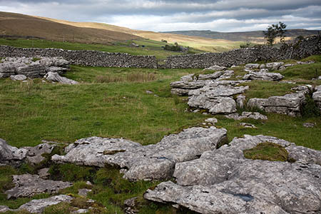 Slog up the grassy path, boggy in parts, then over a broken wall before the path bears left up a grassy break in the limestone outcrops.