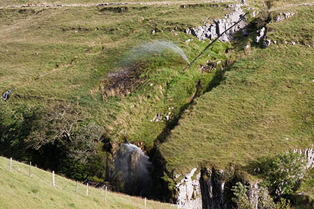 Pass below the farm buildings at Pen-y-ghent House. Across the valley here is a strange phenomenon. Two ruptures in the water pipe descending from Fountains Fell spray water metres into the air.