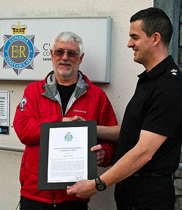 Kendal Mountain Search and Rescue Team’s former leader Eddie Harrison was presented with a certificate of merit by Chief Superintendent Steve Johnson of Cumbria Constabulary.