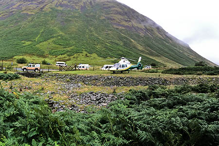The Great North Air Ambulance and mountain rescue vehicles at Dunmail Raise during the incident. Photo: GNAAS