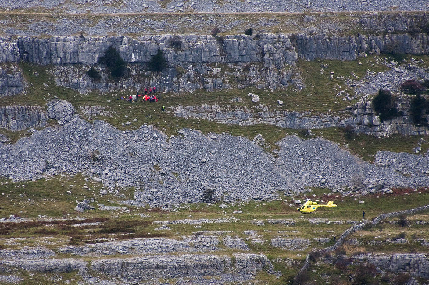 Cave Rescue Organisation members at work at the scene of the fall, as the Yorkshire Air Ambulance waits close by