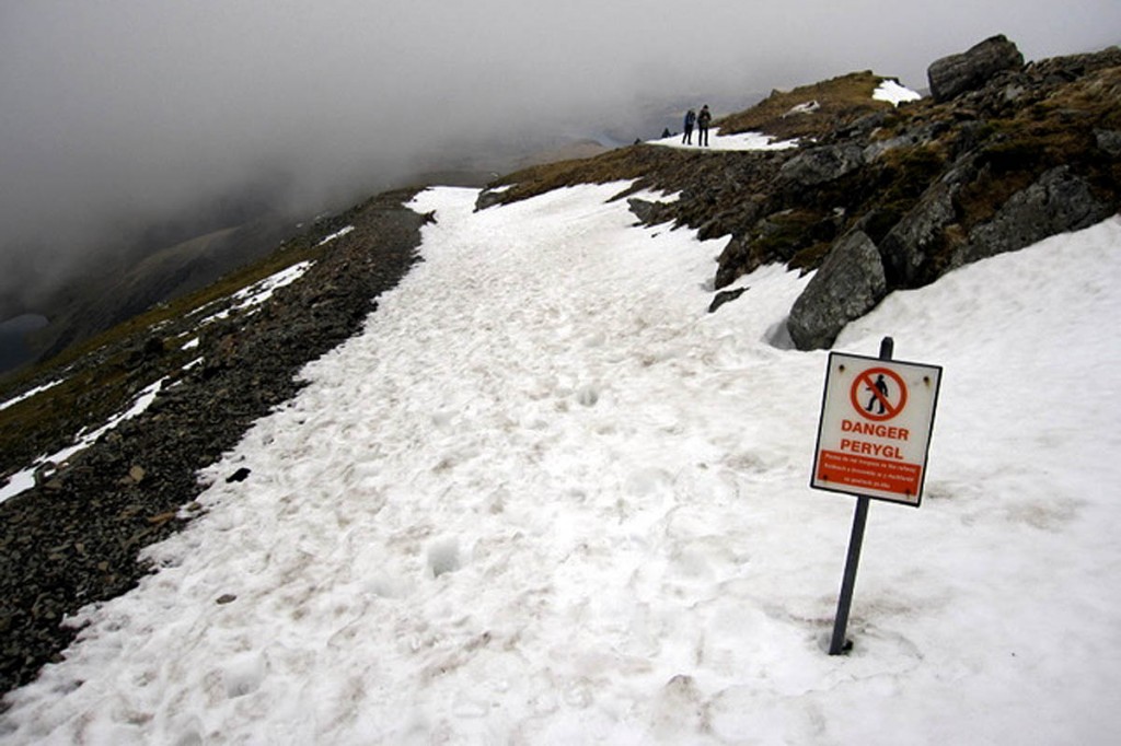 “It is tempting to follow the railway down from the summit rather than the Llanberis Path as it is an easy navigation feature. Unfortunately it takes people very close to the 1,000ft cliffs of Clogwyn Coch and at the moment is banked up with steep and very icy snow.