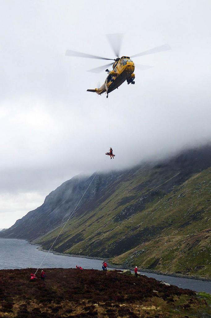 “Undeterred, the yellow Sea King held a hover for sufficient time for the casualty to be winched aboard and flown to hospital in Bangor. As her husband was being walked back to the road head and for delivery to his house, information came through of a 999 call for persons stuck in Tryfan – somewhere.”