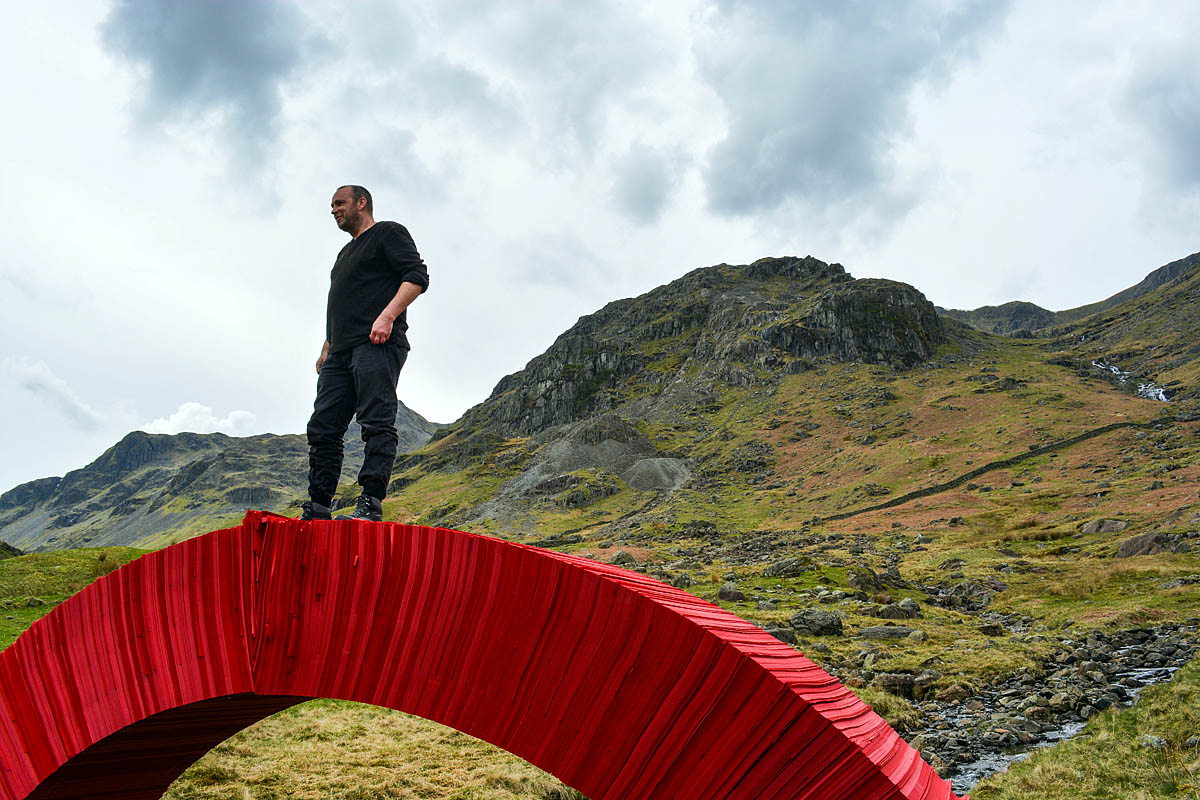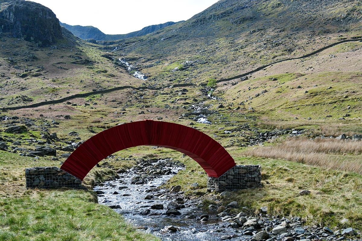 “The piece is a temporary artwork made for and about the landscape of the Lake District, based on local stone bridge construction dating back to Roman times. On an aesthetic level the piece acts as a focal point within a vast open landscape, the bright red colour drawing the eye and interfering with the natural environment, while at the same time creating compositional balance with the green backdrop and flow of water.”