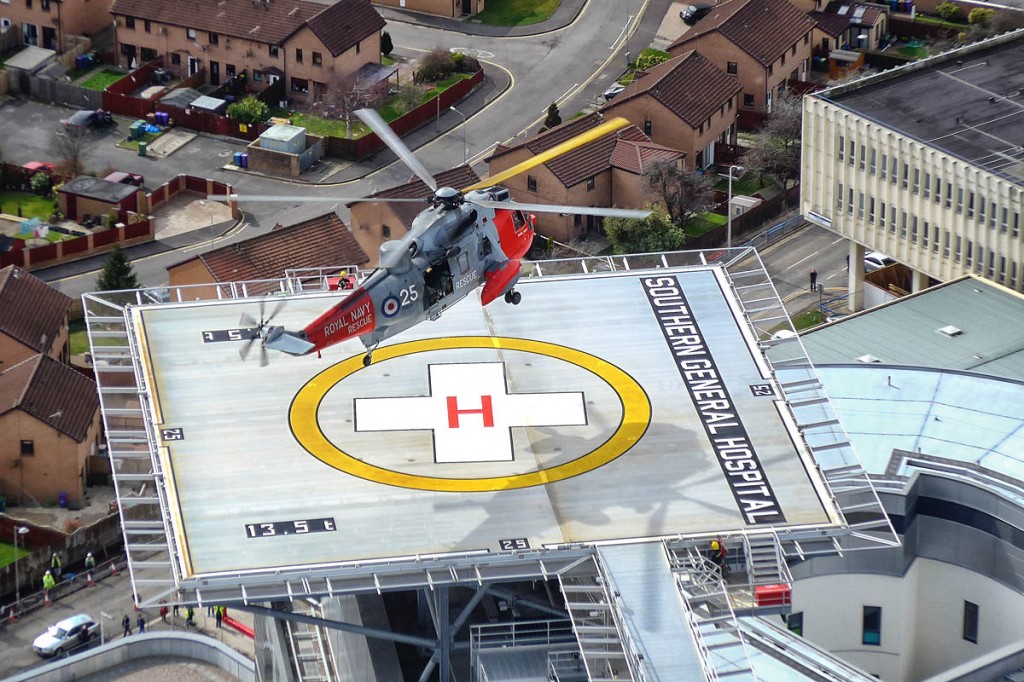 The helipad is perched 14 storeys above ground at South Glasgow University Hospital and was used for the first time in earnest by a Sea King from HMS Gannet on a rescue mission.