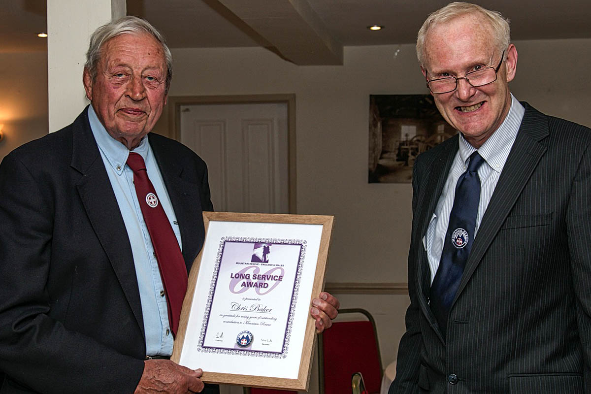 Chris Baker, who has served with the Upper Wharfedale Fell Rescue Association since 1953, received a certificate from a mountain rescue luminary to mark his achievement.