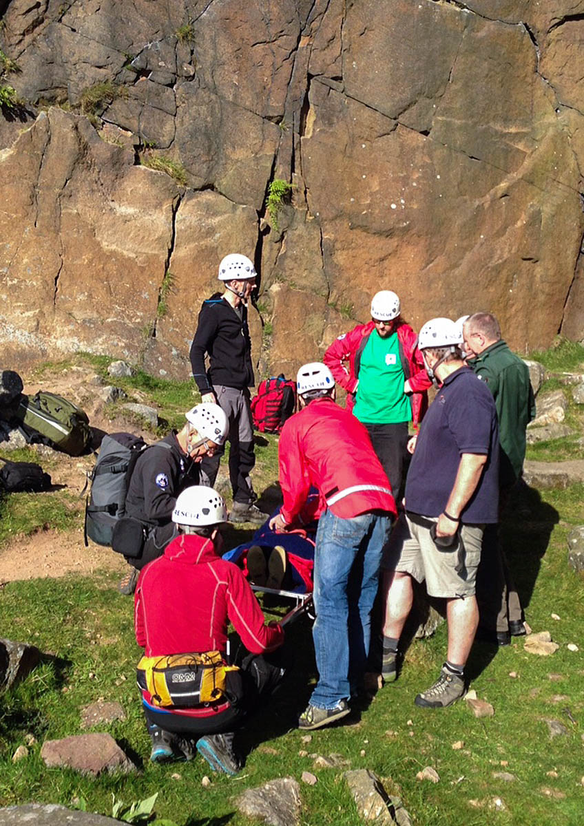 “Team members were not far behind and worked to secure the climber on our vacuum mattress and stretcher for the carry off from the crag and back to the road.