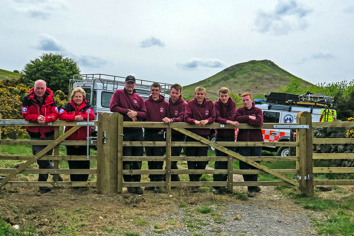 Rescuers and national park staff at one of the gates, with Roseberry Topping in the distance. Photo: Martin Codd/Cleveland MRT