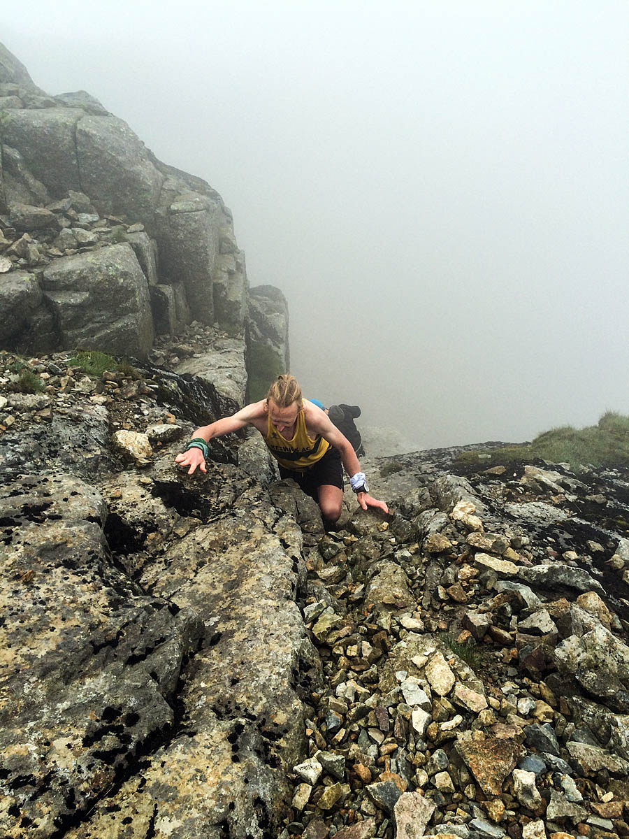 Steve Angus on leg three of the Billy Bland Challenge climbing Broad Stand between Scafell Pike and Scafell, the oldest recorded rock-climb in the Lake District and still a serious undertaking in wet conditions