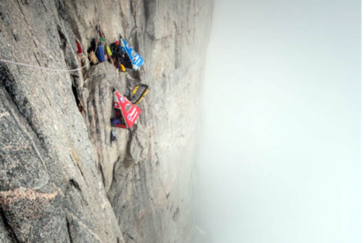 In the process, three of the team were struck down by diarrhoea and vomiting, slowing down the whole expedition. Once they had worked out a potential route on the unclimbed north-west face, the team set up a hanging port-a-ledge camp, the Bedouin Camp, on the wall and started the serious climbing.