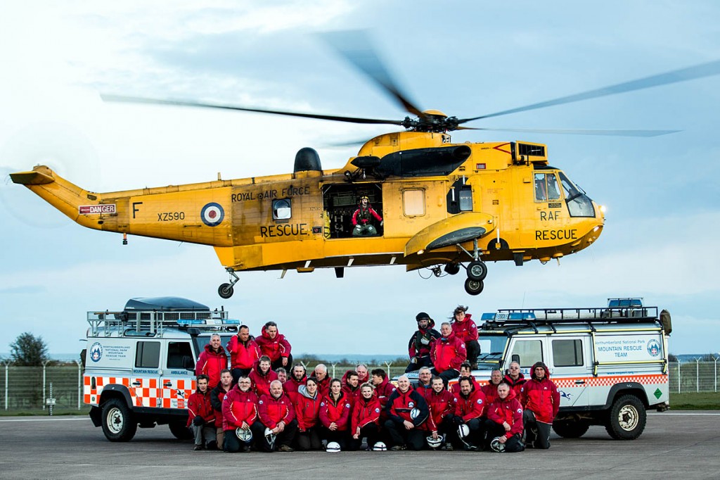 The Northumberland National Park Mountain Rescue Team with an RAF Sea King helicopter before the service ended