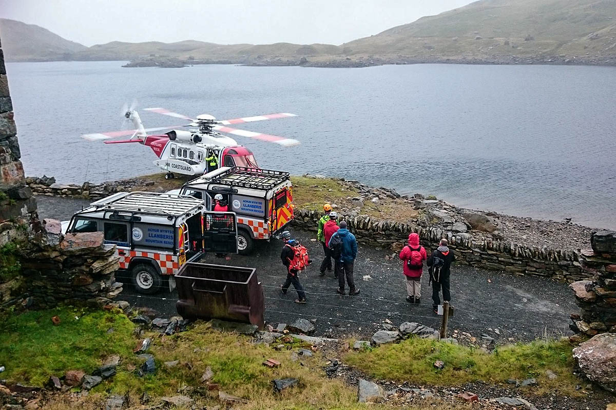 Rescue team members at the site, with the Caernarfon Coastguard helicopter. Photo: Elidir Owen/Miles Hill/Llanberis MRT