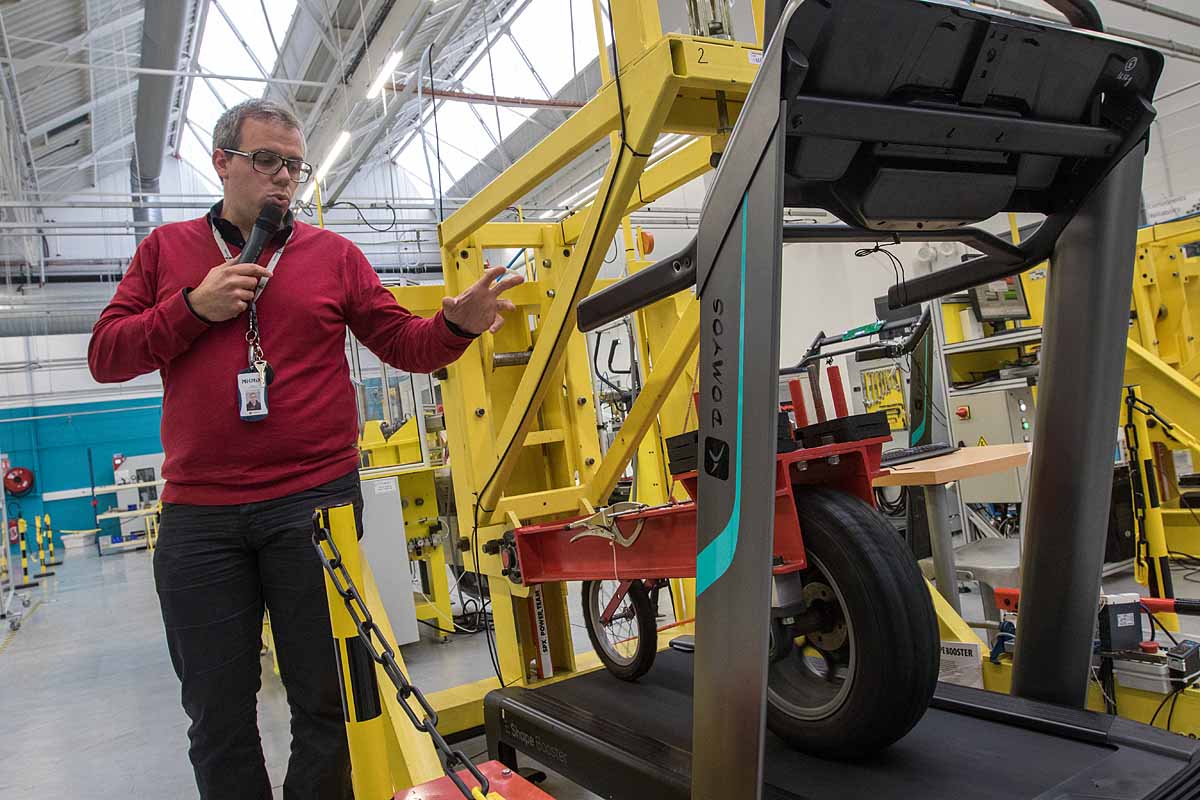 We’re then shown the b’Twin design area, where prototypes are developed and models tested. A bike on a treadmill is subjected to 1,000 hours of running. Other departments put frames through a stress test. In total, the b’Twin laboratories perform 11,000 tests on bikes and components worldwide each year.