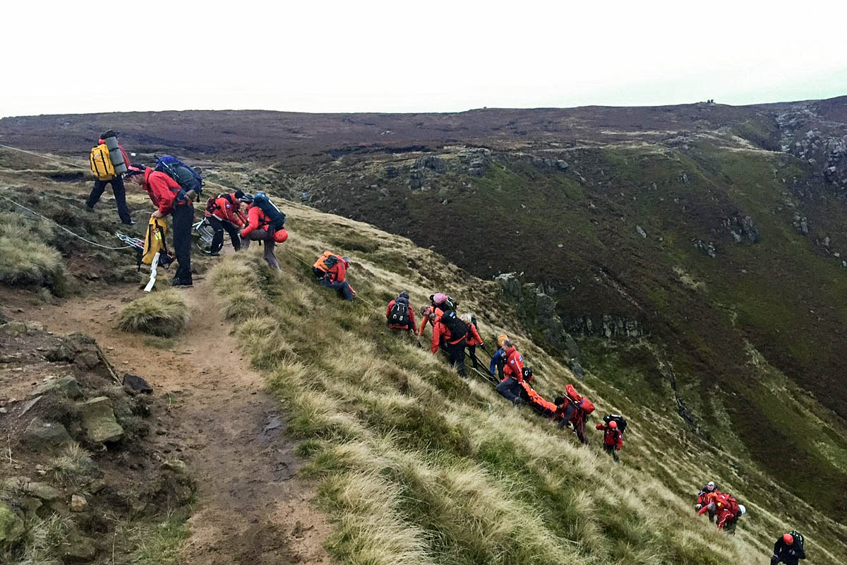 “Due to the location, the easiest extraction path was actually to carry up the steep sides of Grindsbrook and head south, up to Grindsbrook Knoll. This required team members to sledge the stretcher up the steep slope to the top edge path with the aid of a back rope for security on the steep ground.