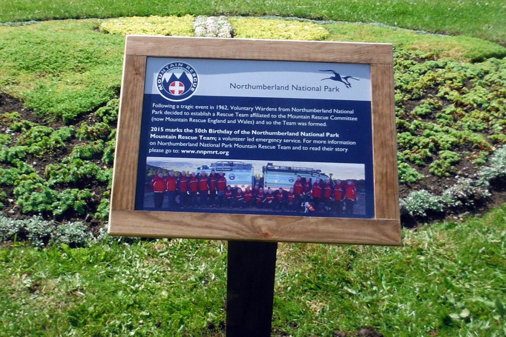 Rothbury Parish Council has created the Mountain Rescue England and Wales logo with plants in a prominent central location within the village and a plaque next to the flower bed installed by the Northumberland National Park Authority provides a history of the formation of the team following tragic events in 1965 where two shepherds perished in a blizzard.