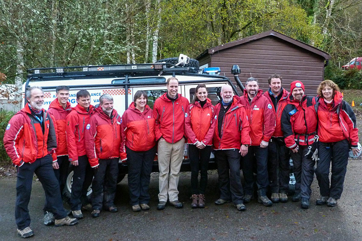 The royal couple line up with mountain rescuers, including Chris Lloyd, left, and Mike France, to the right of the duchess