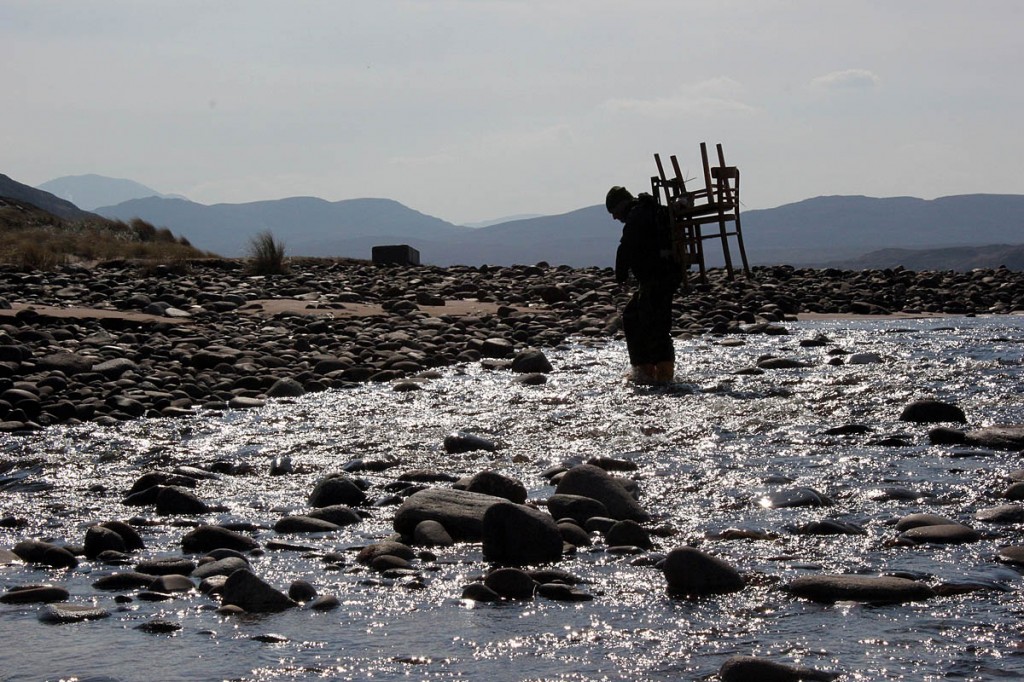 Maintenance organiser Bob Tateson carries supplies across the beach on his way to Strathchailleach Bothy in a scene from the programme