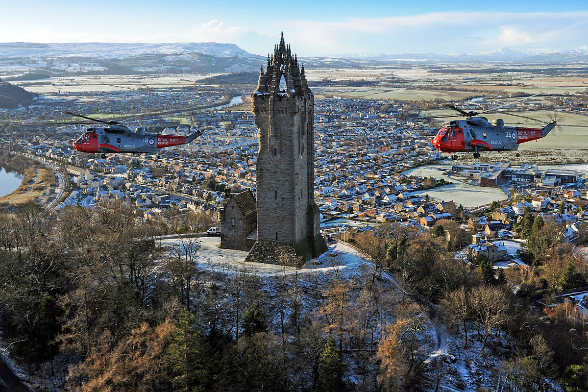 The HMS Gannet Sea Kings pass over the Wallace Monument at Stirling during the fly-past. Photo: Thomas McDonald/Royal Navy