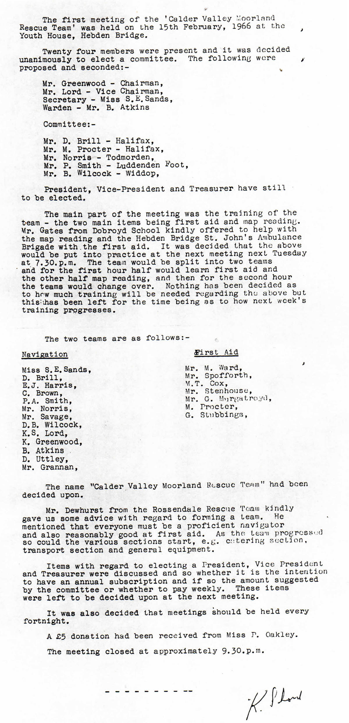 The team, originally called the Calder Valley Moorland Rescue Team, was inaugurated at a meeting in Hebden Bridge at which it was decided map reading and first-aid training would be necessary for its members.