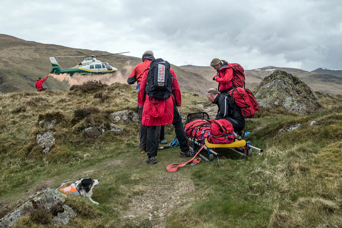 Rescuers guide in the air ambulance at the scene of the incident on High Rigg. Photo: Stuart Holmes/Keswick MRT