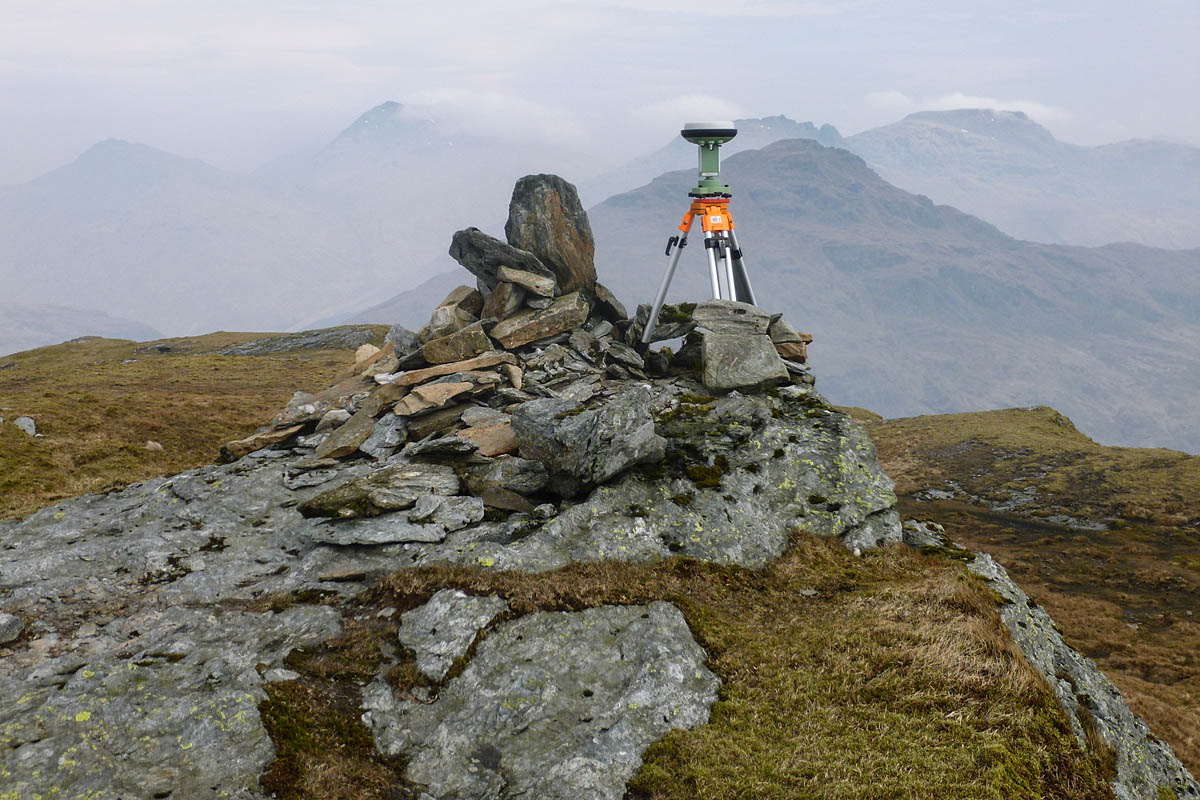 “Ordnance Survey asks for the two hours of data to be collected in order to ensure a robust data set. As that time ticked by the weather improved and a party of four people arrived and helped us pass the time, while the receiver collected its data. They were from Glasgow and had ascended Cnoc Coinnich by the Ardgarten route.