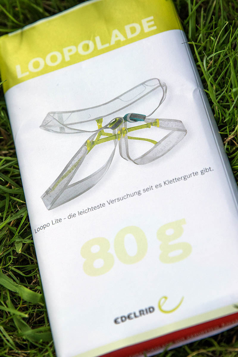 Edelrid isn’t going into the confectionery business, but was emphasising the point that the chocolate weighed the same as its new climbing harness, the Loopo Lite.