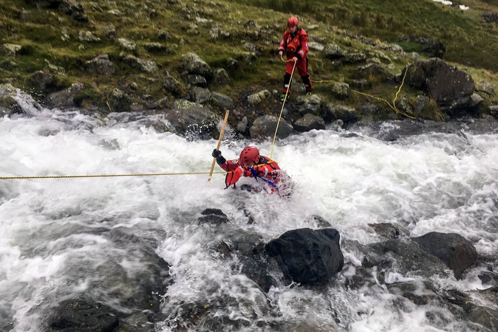 Swiftwater technicians from the Wasdale team cross the swollen beck in Lingmell Gill on Saturday. Photo: Wasdale MRT