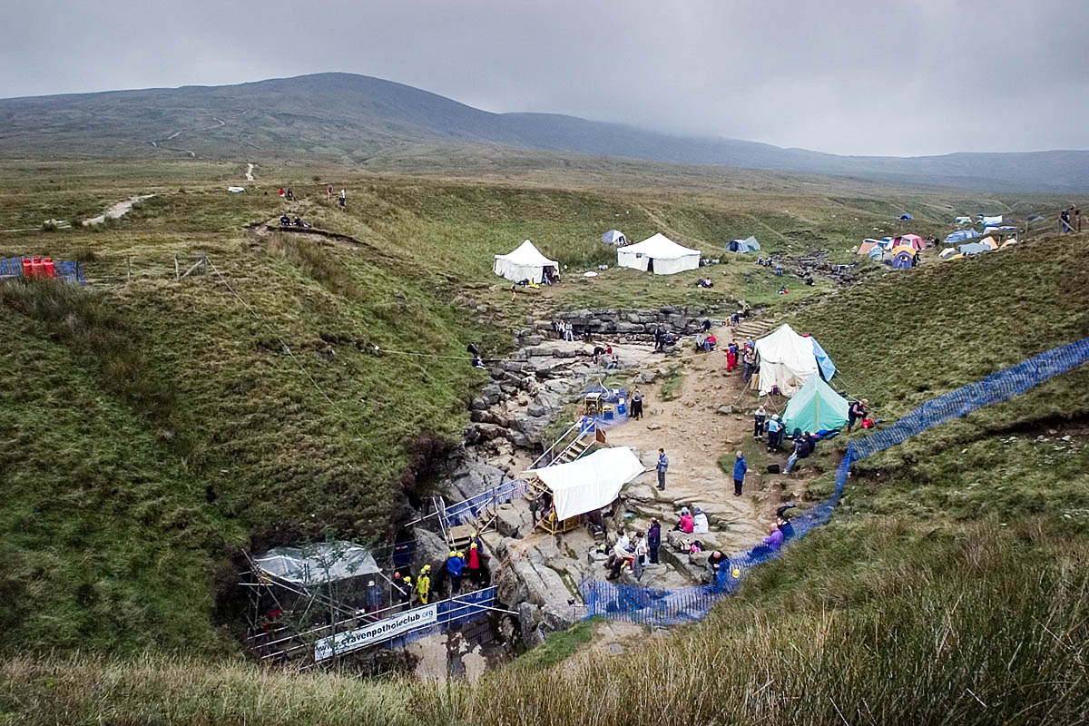 The winch meet is operated during the August bank holiday week by Craven Pothole Club and by Bradford Pothole Club at the May bank holiday. The clubs set up a winch to allow non-cavers to descend the main 100m-deep shaft of Gaping Gill, one of Britain’s largest natural caverns.