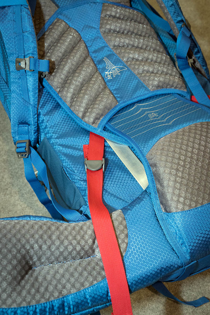 It features Excel 210 denier double line ripstop nylon material and a 1,680 denier reinforced base. Delrin struts are designed to distribute the pack’s weight to the hips. There’s a front-opening panel for access to contents as well as top lid access with extendable gaiter.