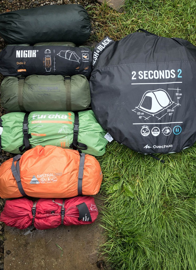 The packed tents, from top: Bergans of Norway; Nigor; Snugpak; Eureka; Vango, and MSR, with the Quechua, right