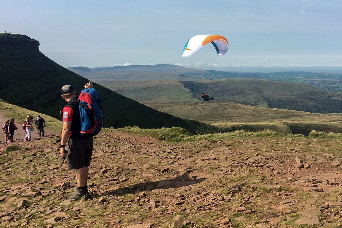 Rescuers have praised passers-by who went to the aid of a paraglider injured in a crash on south Wales’s second-highest peak.