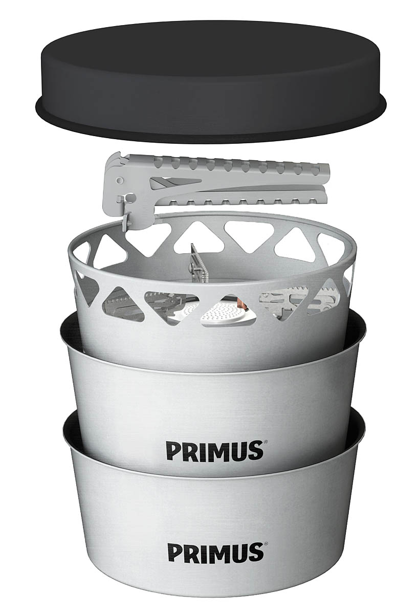 The starter stove set also comes in a 1.3l version, suitable for one to three people or in a larger, 2.3l version suitable for two to five people. The set consists of windscreen with integrated burner, two aluminium pots that pack away efficiently without rattling during transport, a non-stick frying pan that doubles as a lid and a patented pot gripper.