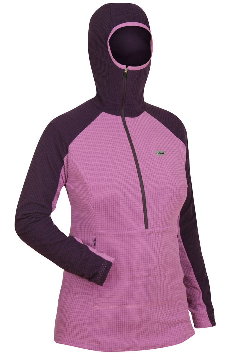 The fleece has a simple, close-fitting hood for use under a helmet when needed, and its zip is off-centre to avoid bulk when used in a layering system and to improve comfort in the chin and mouth area. Its simple cuffs can be pushed up the arms for cooling, and the jacket has a lower back hem for extra protection.