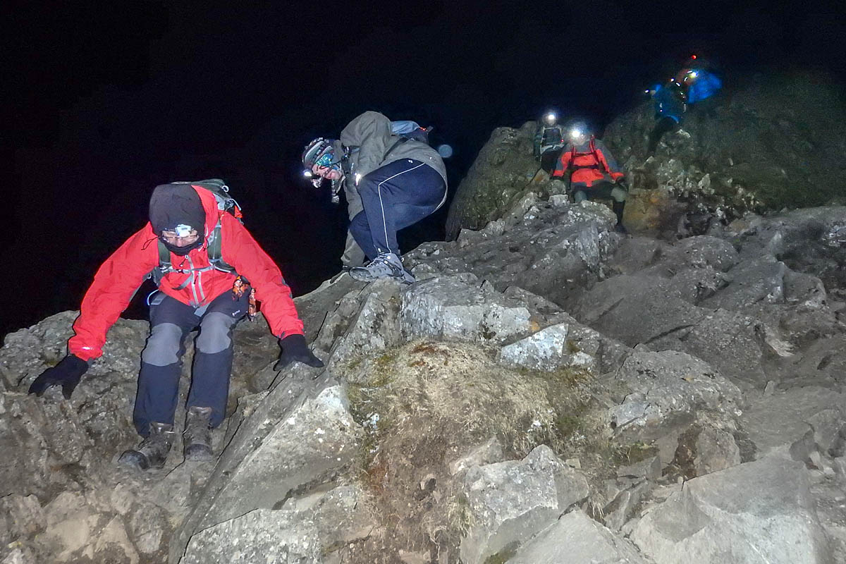 To mitigate against some of the issues we ask that everyone who joins the event details their scrambling experience. If they don't tell us, or have none, they cannot join the event. On top of this, there will be a qualified mountain leader for every 8 people on the mountain. Plenty of safety cover to give advice or lend a hand should anyone find the night element more challenging than expected. Further to this, many of these leaders will be serving members of MRT, a great add on so the walkers can maybe understand more about the associations.