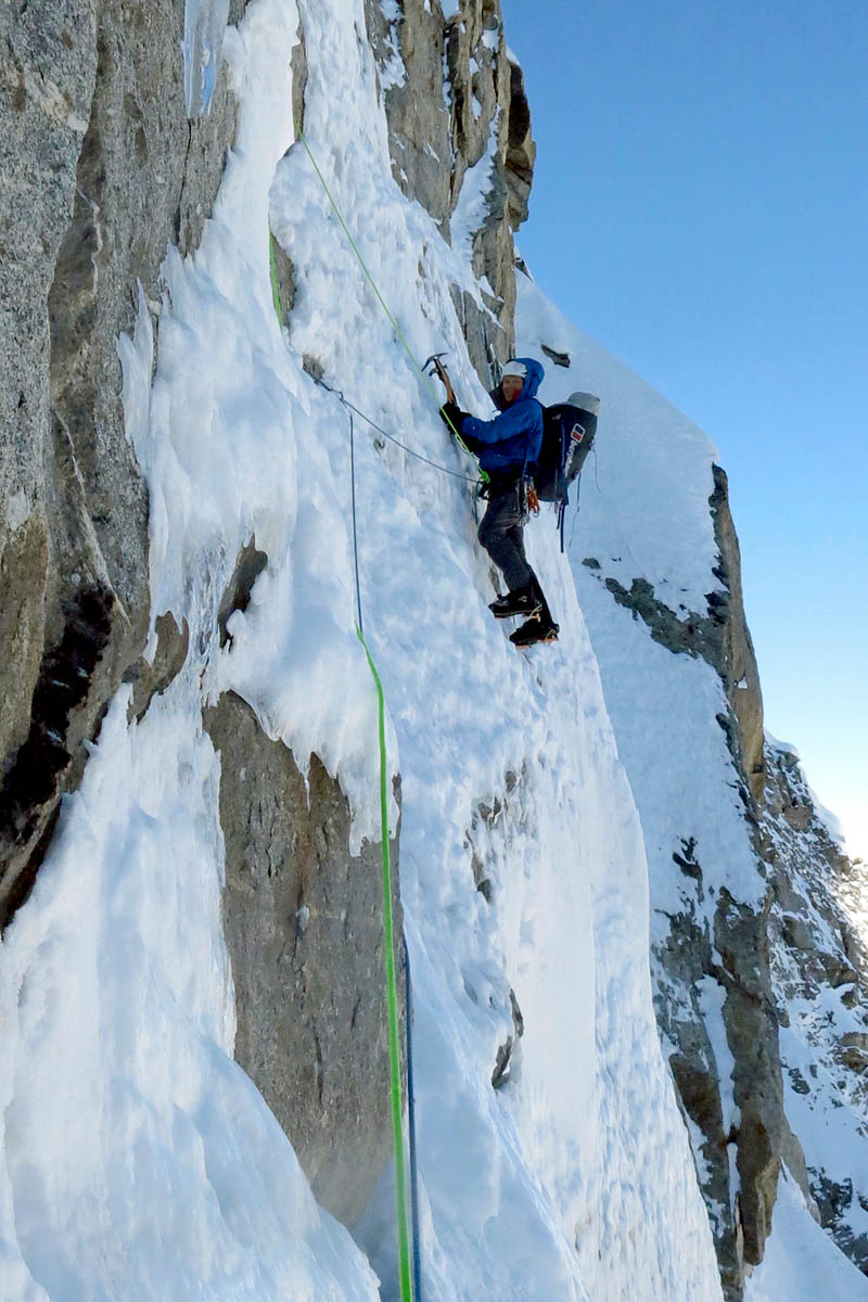 “At 6.30pm on our fifth day on the face it fell to me to aid and cut through the cornice to emerge onto the south side. After another cold bivouac on narrow ice ledges, the previously unclimbed 150m summit block was dispatched and it was time to head down the complex glacier systems of the south and west face.